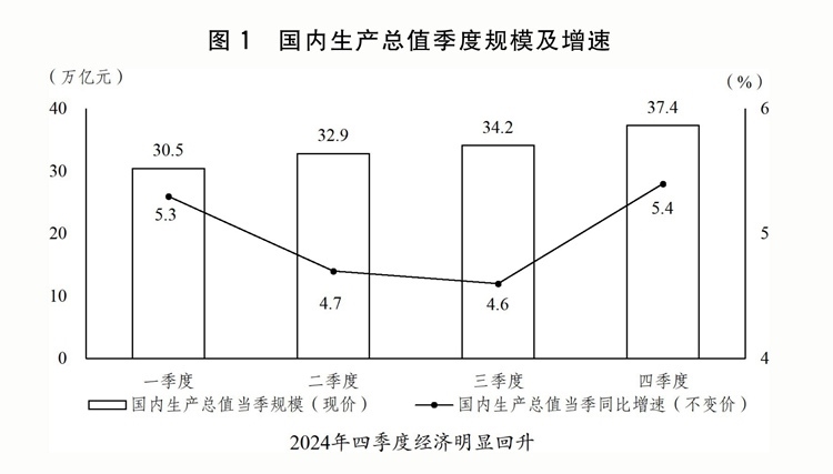 (一)因時(shí)因勢(shì)加強(qiáng)和創(chuàng)新宏觀調(diào)控,推動(dòng)經(jīng)濟(jì)回升向好。扎實(shí)開(kāi)展宏觀政策逆周期調(diào)節(jié),加大政策力度,釋放政策效能,特別是9月26日中央政治局會(huì)議果斷部署一攬子增量政策,市場(chǎng)預(yù)期、社會(huì)信心有效提振,四季度經(jīng)濟(jì)明顯回升。全年國(guó)內(nèi)生產(chǎn)總值(GDP)134.9萬(wàn)億元、增長(zhǎng)5%,其中,一、二、三產(chǎn)業(yè)分別增長(zhǎng)3.5%、5.3%、5%。