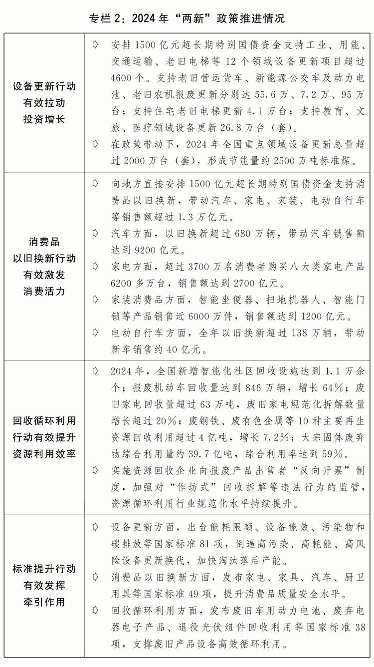 三是大規(guī)模設(shè)備更新和消費(fèi)品以舊換新政策落地見(jiàn)效。印發(fā)“兩新”行動(dòng)方案,出臺(tái)工業(yè)、建筑市政、交通、農(nóng)業(yè)、教育、文旅、醫(yī)療等七大領(lǐng)域設(shè)備更新實(shí)施方案和消費(fèi)品以舊換新、回收循環(huán)利用、標(biāo)準(zhǔn)提升引領(lǐng)行動(dòng)方案。安排3000億元超長(zhǎng)期特別國(guó)債加力支持“兩新”工作。2024年,“兩新”政策帶動(dòng)全國(guó)設(shè)備工器具購(gòu)置投資增長(zhǎng)15.7%,高于固定資產(chǎn)投資(不含農(nóng)戶(hù))增速12.5個(gè)百分點(diǎn);限額以上單位家用電器和音像器材類(lèi)、家具類(lèi)商品零售額分別增長(zhǎng)12.3%、3.6%,帶動(dòng)大宗耐用消費(fèi)品銷(xiāo)售額超過(guò)1.3萬(wàn)億元;消費(fèi)品以舊換新活動(dòng)中,新能源汽車(chē)銷(xiāo)量占比超過(guò)60%,一級(jí)能效家電銷(xiāo)售額占比超過(guò)90%。