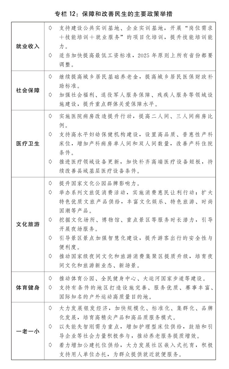 一是實(shí)施提振消費(fèi)專(zhuān)項(xiàng)行動(dòng)。制定提升消費(fèi)能力、增加優(yōu)質(zhì)供給、改善消費(fèi)環(huán)境政策舉措,穩(wěn)定大宗消費(fèi)、擴(kuò)大服務(wù)消費(fèi)、拓展新型消費(fèi)、合理增加公共消費(fèi),推動(dòng)消費(fèi)提質(zhì)升級(jí)。多渠道促進(jìn)居民增收,推動(dòng)中低收入群體增收減負(fù),完善勞動(dòng)者工資正常增長(zhǎng)機(jī)制。因城施策調(diào)減房地產(chǎn)消費(fèi)限制性措施,推動(dòng)建設(shè)安全、舒適、綠色、智慧的“好房子”,更好滿(mǎn)足人民群眾剛性和改善性住房需求、高品質(zhì)居住需要。進(jìn)一步優(yōu)化汽車(chē)限購(gòu)管理政策,加快構(gòu)建充電基礎(chǔ)設(shè)施體系,開(kāi)展汽車(chē)流通消費(fèi)改革試點(diǎn)。加快拓展文化、旅游、體育、健康、養(yǎng)老、托幼、家政、數(shù)字等服務(wù)消費(fèi),實(shí)施服務(wù)消費(fèi)提質(zhì)惠民活動(dòng)、“百城百區(qū)”文化和旅游消費(fèi)行動(dòng)計(jì)劃。加快培育帶動(dòng)性廣、顯示度高的消費(fèi)新場(chǎng)景,支持影視游戲創(chuàng)作與中華優(yōu)秀傳統(tǒng)文化、特色旅游資源相結(jié)合等融合式沉浸式消費(fèi)新場(chǎng)景發(fā)展。積極發(fā)展首發(fā)經(jīng)濟(jì)、冰雪經(jīng)濟(jì)、銀發(fā)經(jīng)濟(jì)。完善游艇、房車(chē)露營(yíng)等新型消費(fèi)領(lǐng)域管理機(jī)制和行業(yè)標(biāo)準(zhǔn),促進(jìn)“人工智能+消費(fèi)”,優(yōu)化消費(fèi)新業(yè)態(tài)新領(lǐng)域市場(chǎng)準(zhǔn)入環(huán)境,加快推動(dòng)各類(lèi)新技術(shù)應(yīng)用推廣并向消費(fèi)級(jí)產(chǎn)品轉(zhuǎn)化。清理對(duì)消費(fèi)的不合理限制。深入實(shí)施優(yōu)化消費(fèi)環(huán)境三年行動(dòng),加強(qiáng)消費(fèi)信用體系和質(zhì)量標(biāo)準(zhǔn)體系建設(shè),規(guī)范網(wǎng)絡(luò)銷(xiāo)售、直播帶貨領(lǐng)域不合理經(jīng)營(yíng)行為,強(qiáng)化消費(fèi)者權(quán)益保護(hù)。落實(shí)和優(yōu)化帶薪年休假制度。完善外國(guó)人入境居留政策和免稅店政策,推動(dòng)擴(kuò)大入境消費(fèi)。深化國(guó)際消費(fèi)中心城市建設(shè)。