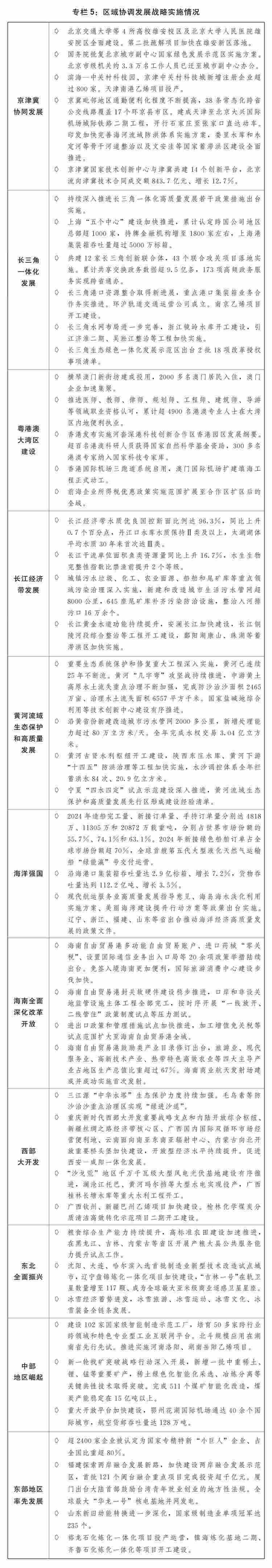 一是區(qū)域協(xié)調(diào)發(fā)展積厚成勢(shì)。京津冀協(xié)同發(fā)展走深走實(shí),在京相關(guān)高校、醫(yī)院、中央企業(yè)總部及二三級(jí)子公司分批向雄安新區(qū)疏解,北京城市副中心行政辦公、商務(wù)服務(wù)、文化旅游等功能不斷完善,進(jìn)一步支持天津?yàn)I海新區(qū)高質(zhì)量發(fā)展若干政策措施出臺(tái)實(shí)施,三省市互聯(lián)互通交通網(wǎng)絡(luò)更加完善、產(chǎn)業(yè)鏈上下游協(xié)作持續(xù)強(qiáng)化、公共服務(wù)共建共享水平進(jìn)一步提升。長(zhǎng)三角一體化高質(zhì)量發(fā)展深入推進(jìn),生態(tài)綠色一體化發(fā)展示范區(qū)改革授權(quán)壓茬推進(jìn),港口資源整合、軌道互聯(lián)互通等取得新進(jìn)展,上?!拔鍌€(gè)中心”建設(shè)進(jìn)一步加快?;浉郯拇鬄硡^(qū)建設(shè)邁上新臺(tái)階,橫琴粵澳深度合作區(qū)封關(guān)“一線”“二線”分線管理運(yùn)行順利,超1.6萬(wàn)名澳門(mén)居民在合作區(qū)居住生活,支持河套深港科技創(chuàng)新合作區(qū)深圳園區(qū)、香港園區(qū)聯(lián)動(dòng)發(fā)展,創(chuàng)新要素跨境流動(dòng)更加便捷。長(zhǎng)江經(jīng)濟(jì)帶共抓大保護(hù)、不搞大開(kāi)發(fā)成效顯著,進(jìn)一步抓實(shí)抓好長(zhǎng)江大保護(hù)工作三年行動(dòng)計(jì)劃出臺(tái)實(shí)施,長(zhǎng)江十年禁漁取得明顯成效,長(zhǎng)江干流連續(xù)5年保持Ⅱ類(lèi)水質(zhì),綜合立體交通走廊加快構(gòu)建,沿江高鐵全線開(kāi)工建設(shè)。黃河流域生態(tài)保護(hù)和高質(zhì)量發(fā)展邁出堅(jiān)實(shí)步伐,農(nóng)業(yè)面源、城鎮(zhèn)生活、工業(yè)和尾礦庫(kù)污染治理深入推進(jìn),8萬(wàn)余個(gè)入河排污口開(kāi)展溯源整治,一批生態(tài)保護(hù)修復(fù)重點(diǎn)項(xiàng)目加快建設(shè),黃河干流連續(xù)3年保持Ⅱ類(lèi)水質(zhì)。海洋強(qiáng)國(guó)建設(shè)深入推進(jìn),海洋強(qiáng)省、現(xiàn)代海洋城市、全國(guó)海洋經(jīng)濟(jì)發(fā)展示范區(qū)創(chuàng)新發(fā)展,海洋生態(tài)環(huán)境質(zhì)量持續(xù)改善,海洋生產(chǎn)總值超10萬(wàn)億元。