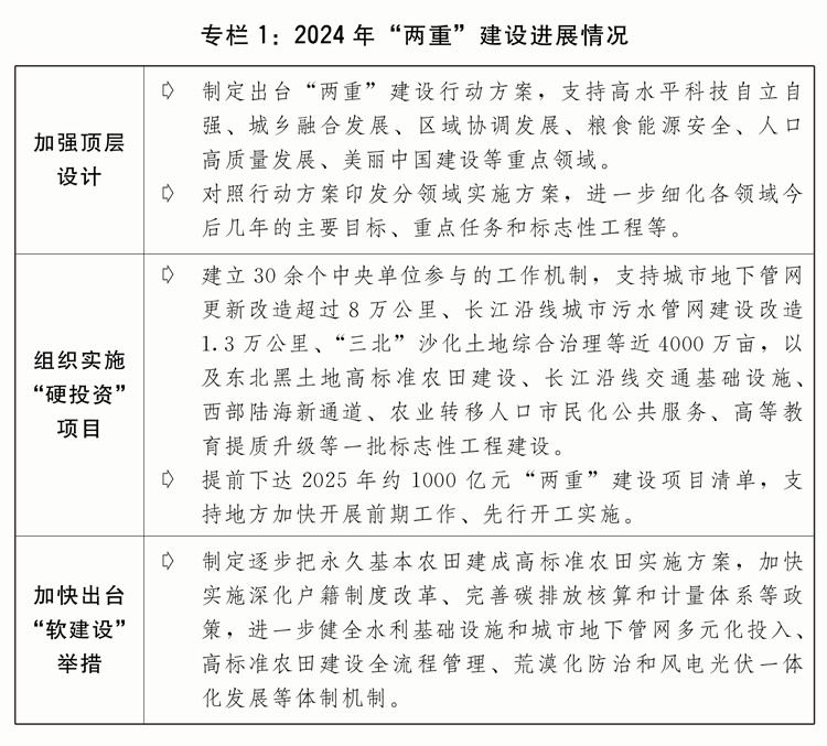 二是發(fā)行超長(zhǎng)期特別國(guó)債支持“兩重”建設(shè)取得積極進(jìn)展。著眼于系統(tǒng)解決強(qiáng)國(guó)建設(shè)、民族復(fù)興進(jìn)程中一些重大項(xiàng)目建設(shè)的資金問(wèn)題,從2024年起發(fā)行超長(zhǎng)期特別國(guó)債支持國(guó)家重大戰(zhàn)略和重點(diǎn)領(lǐng)域安全能力建設(shè)。堅(jiān)持自上而下、軟硬結(jié)合,建立實(shí)施項(xiàng)目?jī)?chǔ)備、集中聯(lián)審、專(zhuān)款專(zhuān)用、強(qiáng)化監(jiān)督等全鏈條推進(jìn)保障機(jī)制。“硬投資”方面,嚴(yán)格做好項(xiàng)目篩選,2024年安排7000億元超長(zhǎng)期特別國(guó)債支持1465個(gè)重大項(xiàng)目建設(shè),項(xiàng)目基本全部開(kāi)工、全年完成投資超過(guò)1.2萬(wàn)億元?!败浗ㄔO(shè)”方面,堅(jiān)持項(xiàng)目建設(shè)和配套改革相結(jié)合,扎實(shí)推進(jìn)規(guī)劃編制、政策制定和體制機(jī)制改革創(chuàng)新,不斷完善投入機(jī)制、提高投入效率。規(guī)范項(xiàng)目全過(guò)程管理方面,出臺(tái)“兩重”建設(shè)有關(guān)管理辦法,督促項(xiàng)目加快開(kāi)工建設(shè),嚴(yán)格資金監(jiān)管,加強(qiáng)監(jiān)測(cè)調(diào)度和現(xiàn)場(chǎng)監(jiān)督檢查,確保建成優(yōu)質(zhì)工程、精品工程、放心工程。