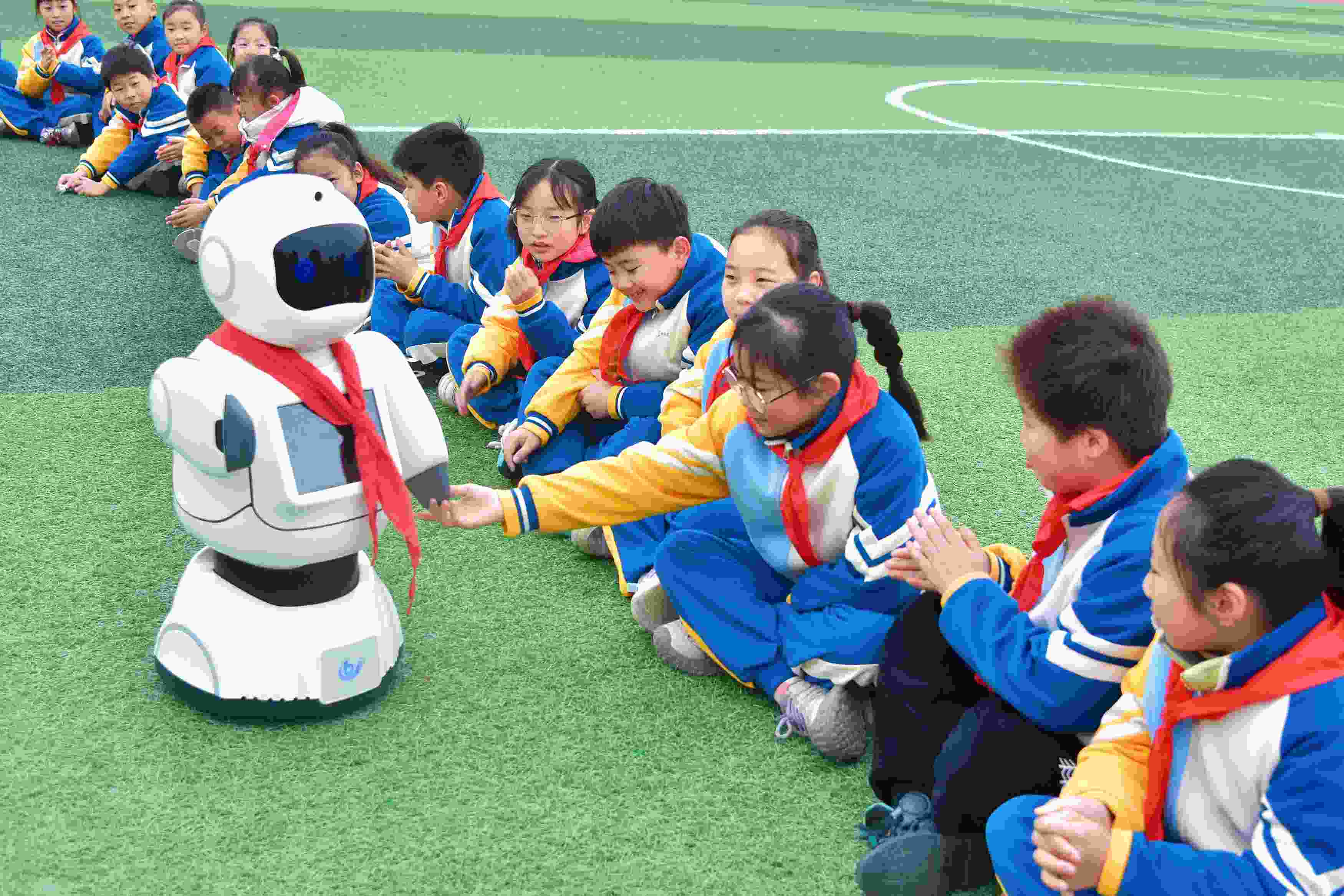 △2025年3月10日,江蘇南通,如皋經(jīng)濟(jì)技術(shù)開發(fā)區(qū)實驗小學(xué)課間,學(xué)生與智能機(jī)器人“賓果”互動。
