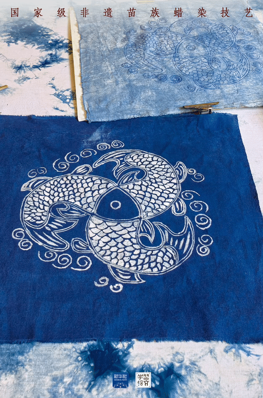 染色,就是將畫好圖案的土布,放入藍(lán)靛染缸中,反復(fù)浸泡多次,確保其上色。其間,作為防染劑的蠟自然龜裂,使布面呈現(xiàn)特殊的“冰紋”,具有獨特魅力。