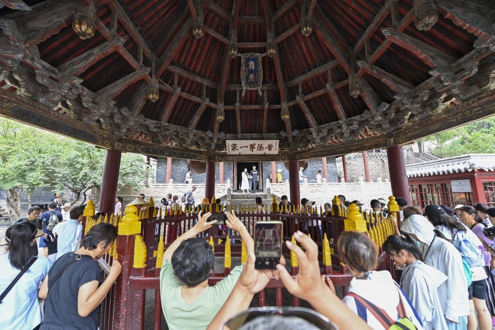位于太原的晉祠,是祭祀西周初晉國首任諸侯唐叔虞的祠堂,是集中國古代祠祀建筑、園林、雕塑、壁畫、碑刻藝術(shù)于一體的珍貴的千年古祠,是首批全國重點文物保護(hù)單位之一。這是2024年7月25日,游客在晉祠博物館參觀。