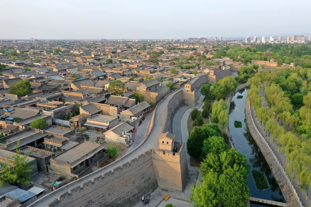 山西平遙古城城墻和護(hù)城河一角(2024年5月9日攝,無人機照片)。近年來,當(dāng)?shù)卣ㄟ^加固城墻、維護(hù)歷史建筑、逐步建立古城違建整治長效機制等措施,使這座“活著的古城”散發(fā)新的生機。