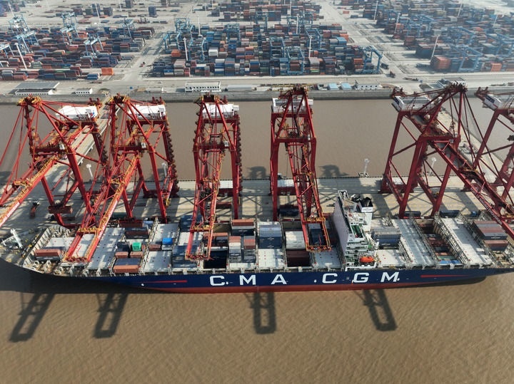 貨輪在浙江寧波舟山港金塘港區(qū)大浦口集裝箱碼頭泊位上裝卸集裝箱(2025年1月4日攝,無(wú)人機(jī)照片)。新華社發(fā)(鄒訓(xùn)永 攝)
