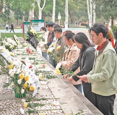 4月4日清明節(jié),湖北武漢江漢大學(xué)的師生自發(fā)前往武漢市解放公園,緬懷為阻擊日寇而英勇犧牲的蘇聯(lián)援華航空隊(duì)烈士。
