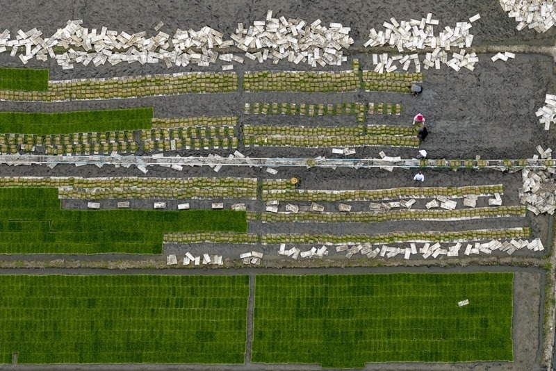 6月19日,在江蘇省連云港市東??h張灣鄉(xiāng)張灣村秧板田里,農(nóng)民起水稻秧苗準(zhǔn)備進(jìn)行機(jī)插作業(yè)(無人機(jī)照片)。