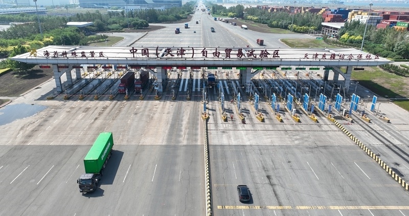 這是6月20日拍攝的天津自貿(mào)區(qū)天津港東疆片區(qū)入口處的中國(guó)(天津)自由貿(mào)易試驗(yàn)區(qū)海關(guān)特殊監(jiān)管區(qū)入口(無(wú)人機(jī)照片)。