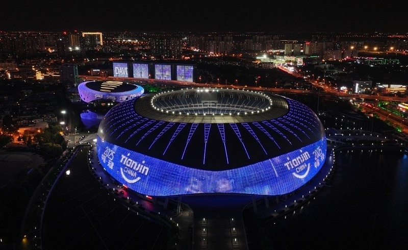 天津奧體中心體育場點亮夏季達(dá)沃斯主題燈光(無人機照片,6月20日攝)。