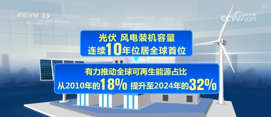 《報告》指出,作為全球最大能源消費國與清潔能源投資國,2024年,中國清潔能源投資規(guī)模為6250億美元,占全球比重的三分之一。光伏、風(fēng)電裝機(jī)容量連續(xù)10年位居全球首位,有力推動全球可再生能源占比從2010年的18%提升至2024年的32%。