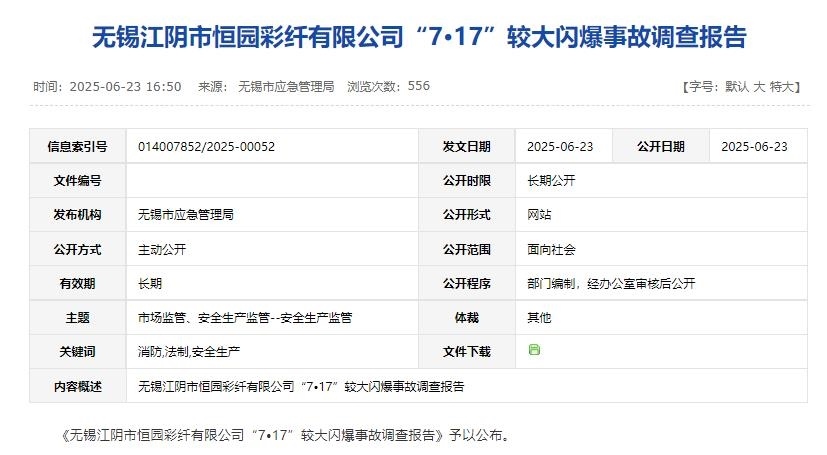 調(diào)查認定,無錫江陰市恒園彩纖有限公司“7·17”較大閃爆事故是一起因崗位員工盲目操作,生產(chǎn)單元安全設(shè)施缺失,現(xiàn)場應急處置不當,地方黨委、政府及其有關(guān)部門履職不到位而導致的較大生產(chǎn)安全責任事故。