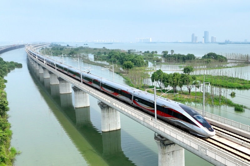 6月30日,一列動車組列車經(jīng)過武漢天興洲大橋延長線(無人機(jī)照片)。