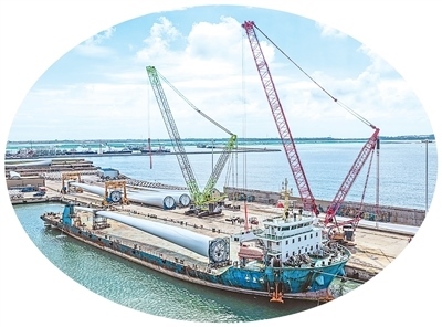 在山東省榮成市石島管理區(qū)的海上風(fēng)電產(chǎn)業(yè)基地,超大型風(fēng)電葉片正在吊裝和運(yùn)輸,準(zhǔn)備運(yùn)往海上作業(yè)區(qū)進(jìn)行安裝。李信君攝(人民視覺(jué))