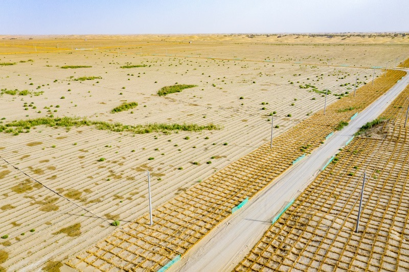 新疆尉犁縣境內(nèi)的塔里木河南岸防沙治沙區(qū)的羅布麻種植區(qū)(左)和固沙草方格(右)(無人機(jī)照片,9月20日攝)。