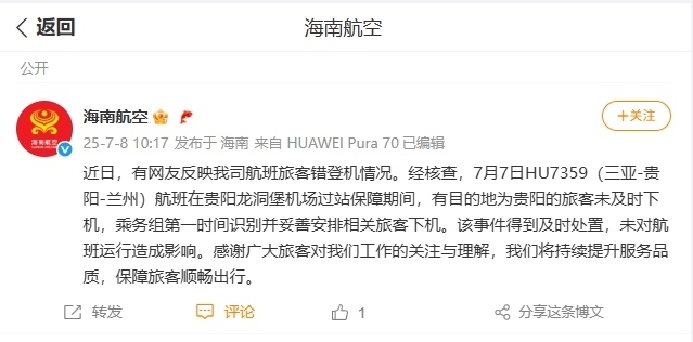 據(jù)海南航空官方微博消息,近日,有網(wǎng)友反映海南航空航班旅客錯登機(jī)情況。經(jīng)核查,7月7日HU7359(三亞-貴陽-蘭州)航班在貴陽龍洞堡機(jī)場過站保障期間,有目的地為貴陽的旅客未及時下機(jī),乘務(wù)組第一時間識別并妥善安排相關(guān)旅客下機(jī)。該事件得到及時處置,未對航班運(yùn)行造成影響。