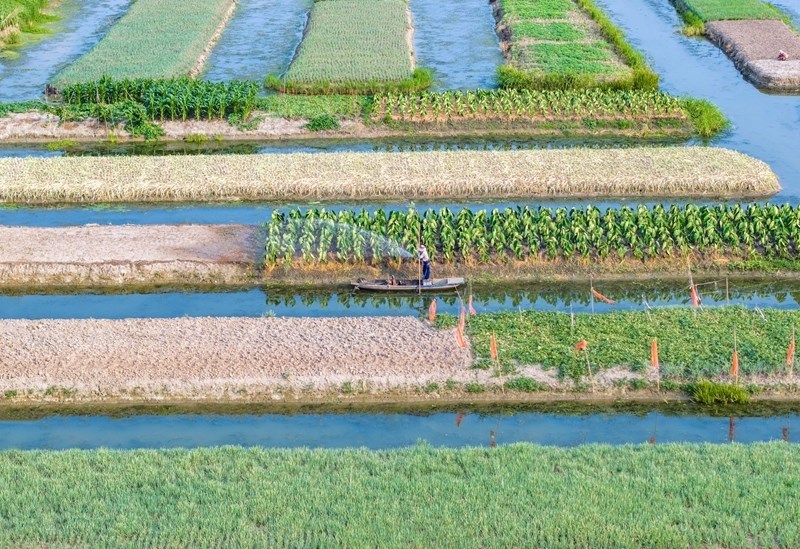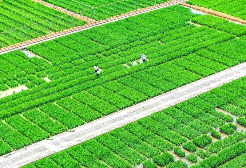 7月7日,在江蘇里下河地區(qū)農(nóng)科所(揚(yáng)州市農(nóng)科院),農(nóng)民在試驗(yàn)田勞作(無人機(jī)照片)。