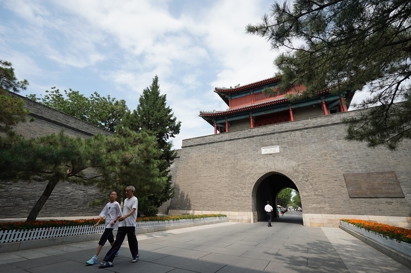 7月7日,人們從宛平城威嚴門前走過。
