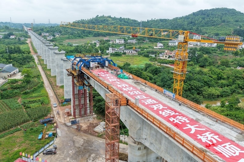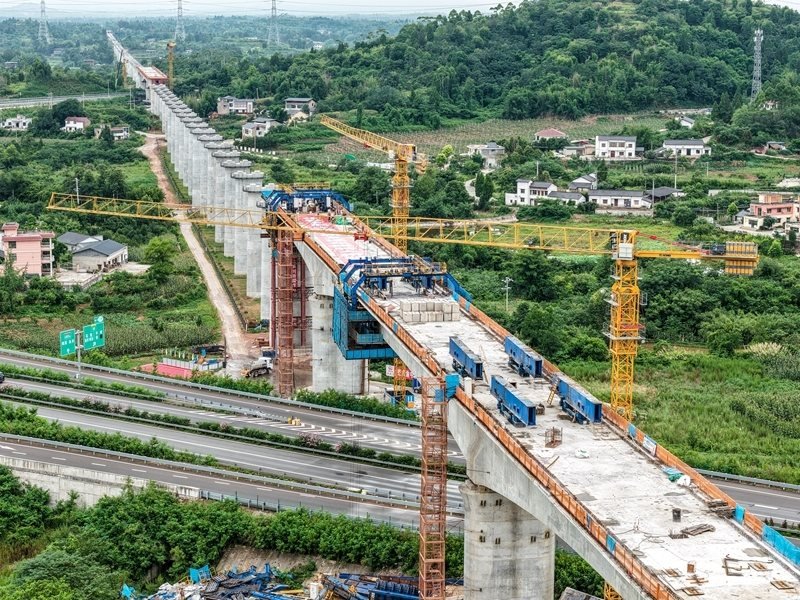 當(dāng)日,由中鐵五局承建的成渝中線高鐵土橋樞紐互通雙線特大橋連續(xù)梁順利合龍,該連續(xù)梁全長約242米,是成渝中線高鐵重慶段跨度最大的連續(xù)梁。土橋樞紐互通雙線特大橋位于重慶市銅梁區(qū),全長3271.6米,上跨重慶三環(huán)高速及銅安高速公路,共設(shè)有92個橋墩,2個橋臺。