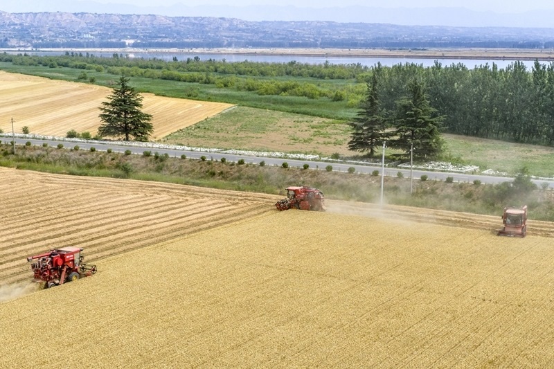 6月9日,河南省三門峽靈寶市西閻鄉(xiāng)東古驛村村民在搶收小麥(無人機照片)。