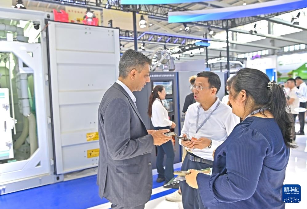 7月12日,國外客商在沈陽國際展覽中心了解糧食加工機械。新華社記者 周華 攝