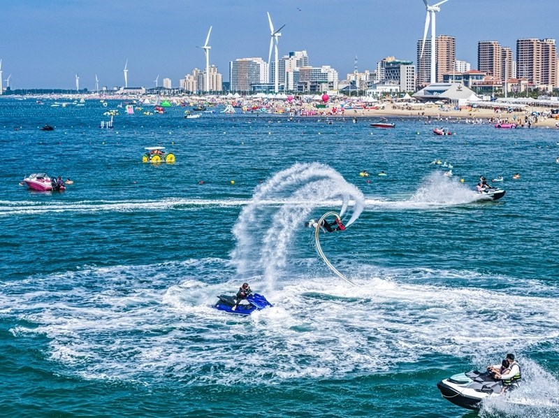 7月12日,在山東省榮成市那香海景區(qū),游客享受海上旅游項目帶來的清涼與歡樂(無人機照片)。