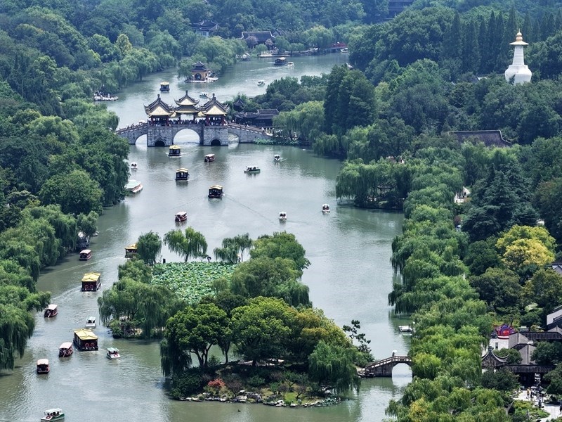 7月13日,游客乘坐游船在江蘇揚州瘦西湖風景區(qū)游覽(無人機照片)。