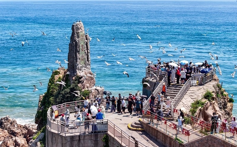 7月12日,山東省榮成市成山頭風景區(qū),游客與黑尾鷗互動(無人機照片)。
