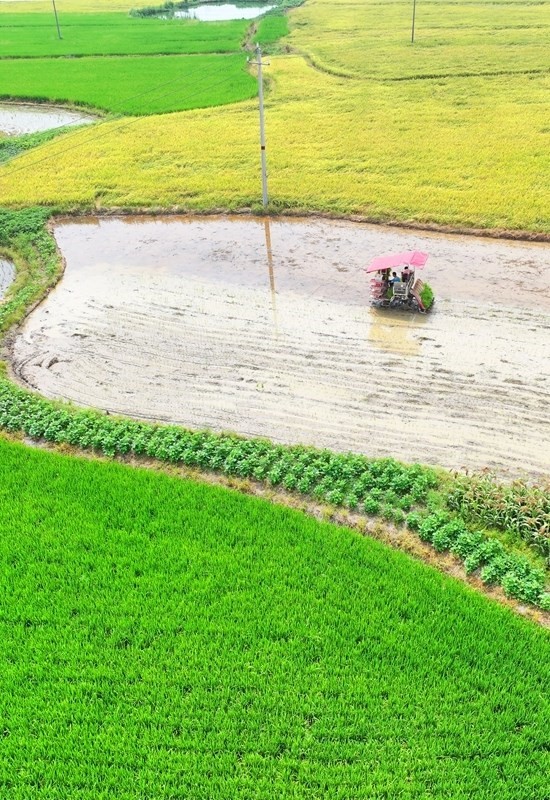 7月13日,湖南省衡陽市衡東縣霞流鎮(zhèn)農(nóng)民駕駛農(nóng)機(jī)進(jìn)行晚稻插秧工作(無人機(jī)照片)。