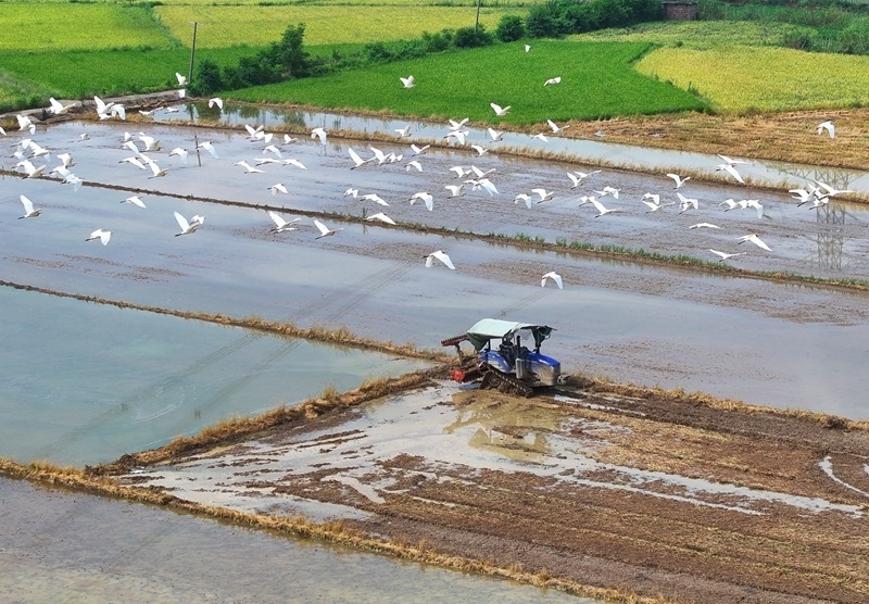 7月13日,湖南省衡陽市衡東縣霞流鎮(zhèn)農(nóng)民駕駛農(nóng)機(jī)翻耕稻田(無人機(jī)照片)。