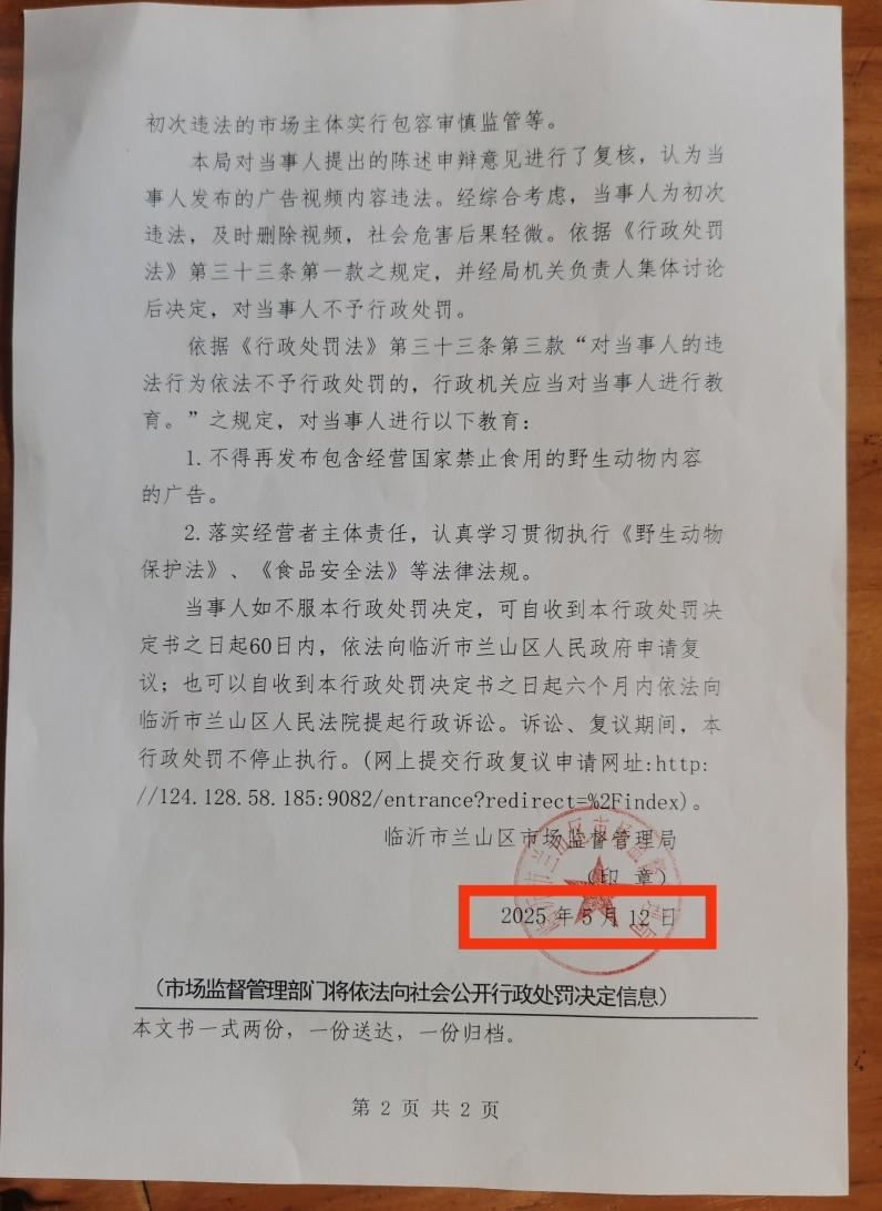 7月14日,山東臨沂“拍蛤蟆湯視頻被罰45萬(wàn)元”事件迎來(lái)最新進(jìn)展。代理此案的律師龔華告訴津云新聞?dòng)浾撸媸嘛堭^收到當(dāng)?shù)厥袌?chǎng)監(jiān)管局送達(dá)的《不予行政處罰決定書(shū)》,但落款時(shí)間卻為5月12日,其認(rèn)為本次送達(dá)的程序不合規(guī)。