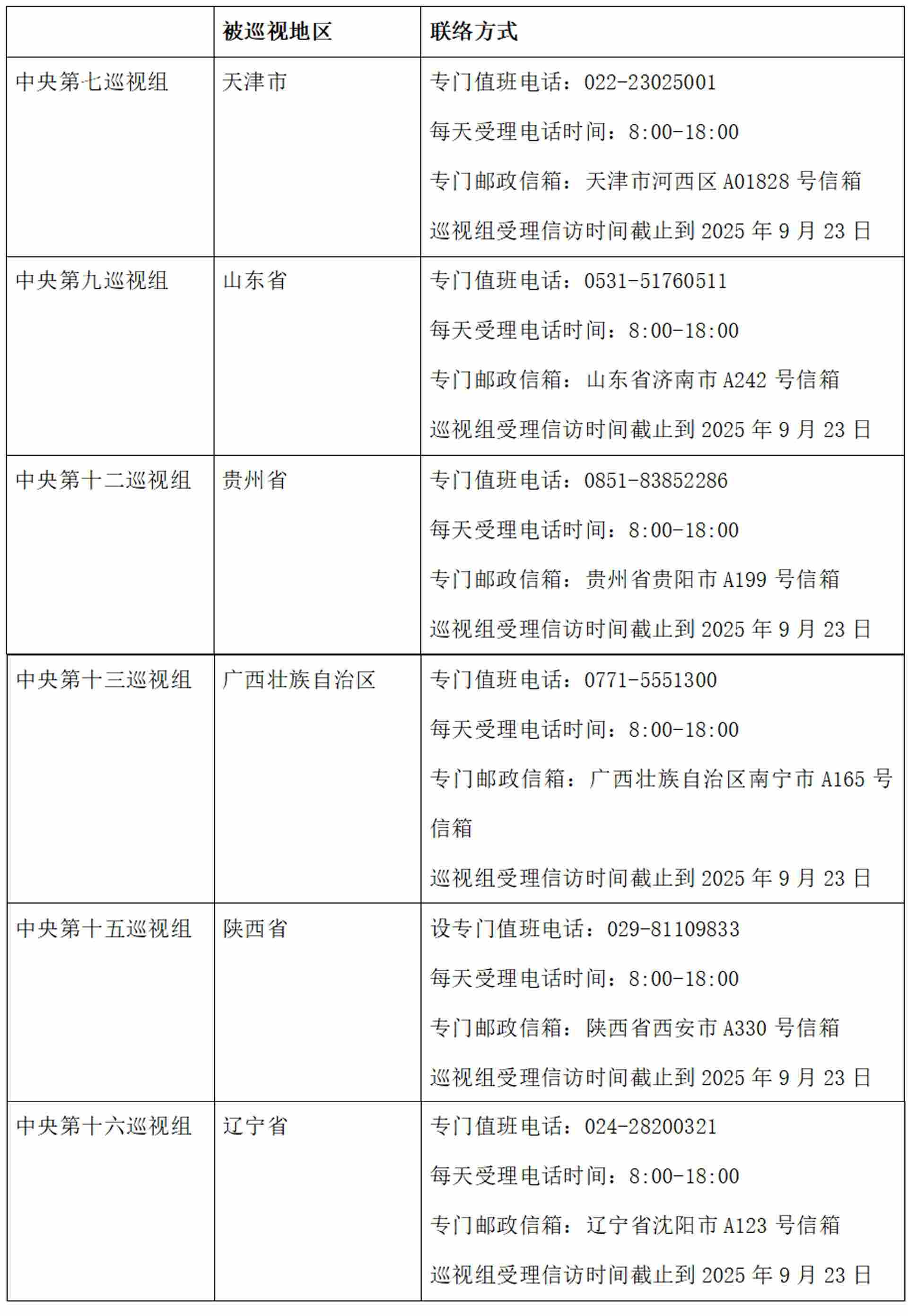 已進駐中央巡視組聯(lián)絡方式:
