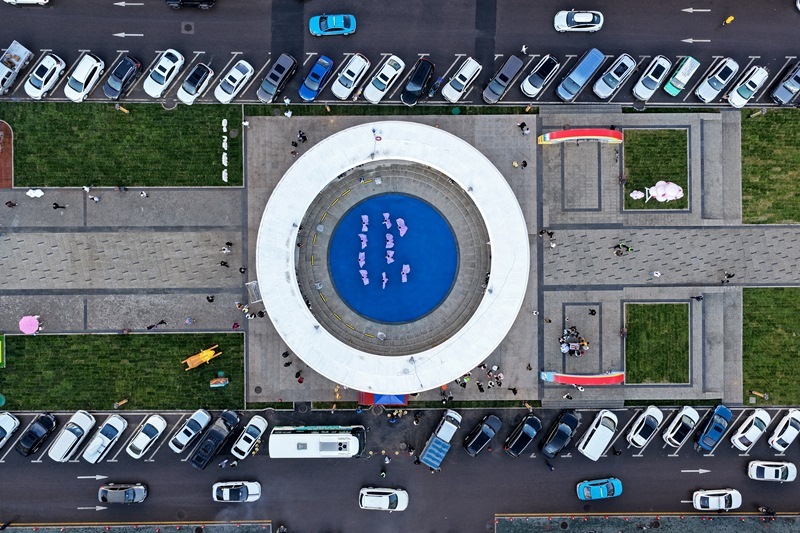7月11日,在昭蘇縣天馬旅游街區(qū),當?shù)匚乃嚬ぷ髡邽橛慰捅硌莞栉韫?jié)目(無人機照片)。