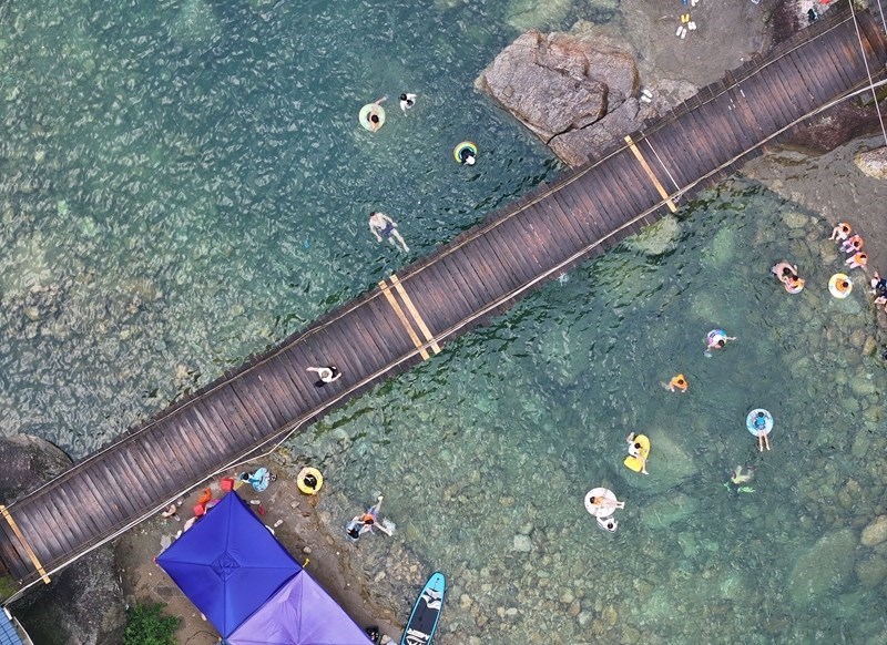 游客在融水苗族自治縣香粉鄉(xiāng)雨卜村戲水消暑(7月19日攝,無人機照片)。