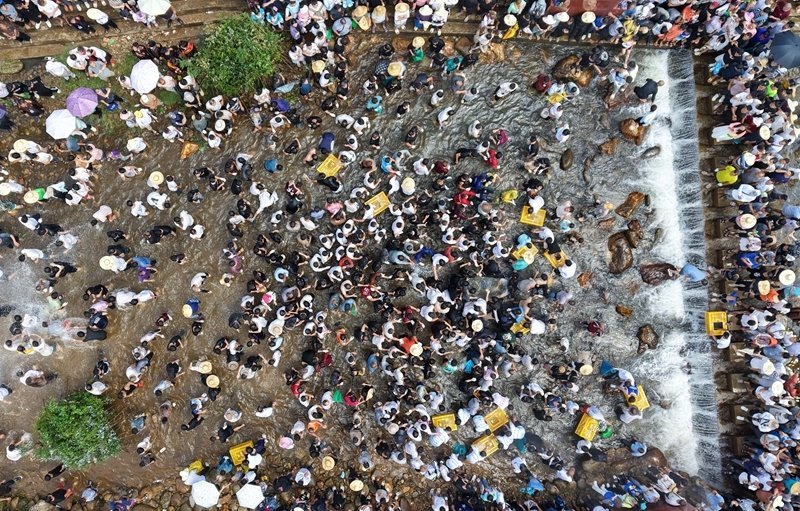 在融水苗族自治縣紅水鄉(xiāng)良雙村鬧魚節(jié)活動中,村民和游客在河里抓魚(7月10日攝,無人機照片)。
