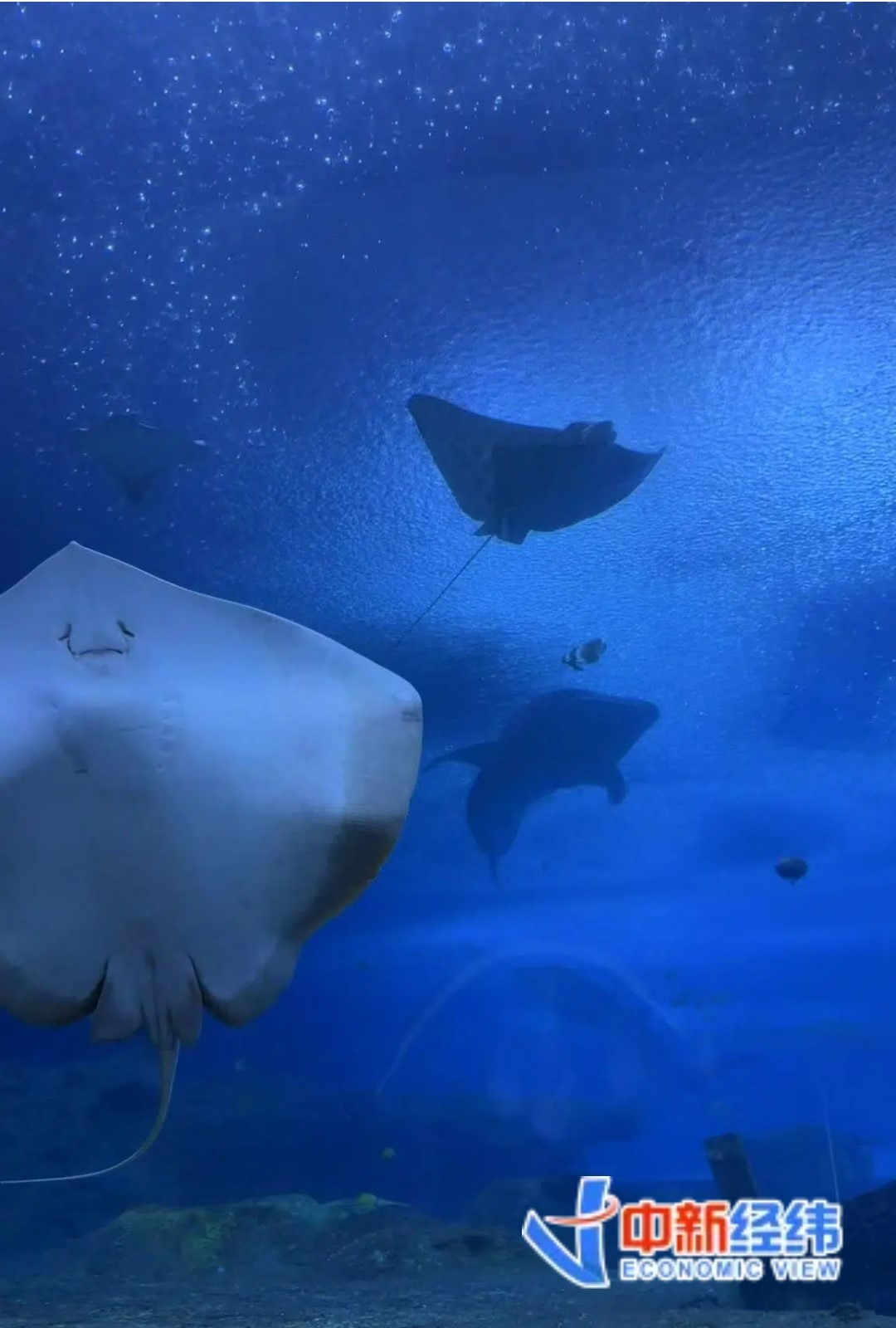在海底區(qū),小林感到自己仿佛來到了海底世界的IMAX影廳,抬頭就能看到各種海底生物在頭上游過。晚上工作人員還會撤去警戒線,讓他們能與動物更加貼近?!澳莻€時候的體驗,就是‘藍(lán)調(diào)時刻’,幽靜又神秘,抬頭就能看到鯨鯊巨物從頭頂游過。夜深一些,還能看到有小魚沉底睡覺休息?!毙×终f道。