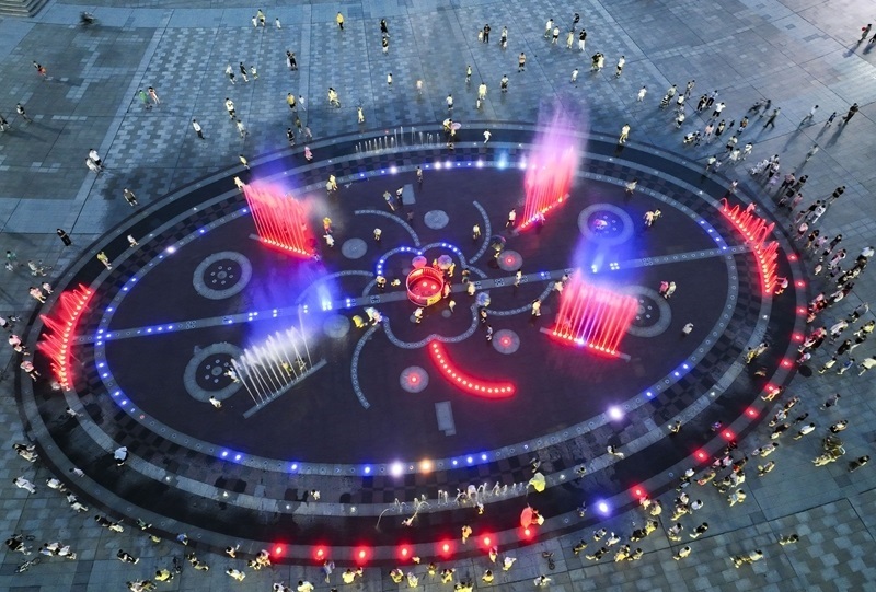 7月24日,市民和游客在河南省濟(jì)源市世紀(jì)廣場(chǎng)賞噴泉納清涼(無(wú)人機(jī)照片)。