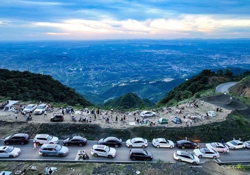 7月25日,四川省華鎣市市民駕車(chē)來(lái)到華鎣山21道拐避暑納涼(無(wú)人機(jī)照片)。