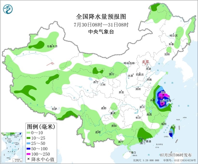 7月29日08時(shí)至30日08時(shí),內(nèi)蒙古東北部、黑龍江北部、吉林中部、遼寧北部、江蘇南部、上海、浙江中東部、臺(tái)灣島中南部、廣東南部等地的部分地區(qū)有大到暴雨,其中,浙江中東部等地的部分地區(qū)有大暴雨(100~200毫米)。內(nèi)蒙古東部有4~5級(jí)風(fēng)。東海大部海域、臺(tái)灣以東洋面偏南海域、巴士海峽將有7~8級(jí)、陣風(fēng)9級(jí)的西南風(fēng),臺(tái)風(fēng)中心經(jīng)過的附近海域風(fēng)力可達(dá)9~10級(jí)、陣風(fēng)11~12級(jí)。