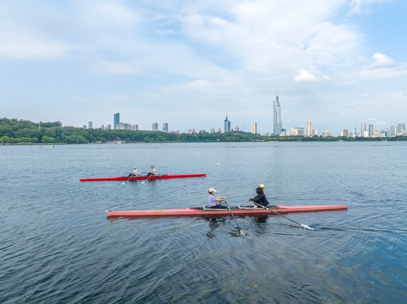 8月8日,市民在江蘇省南京市玄武湖公園劃艇(無人機照片)。