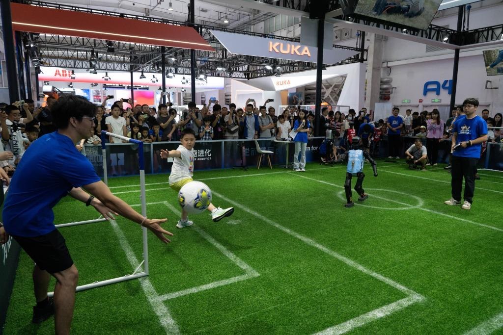 8月8日,觀眾在2025世界機器人大會上與機器人踢足球。新華社記者謝晗攝