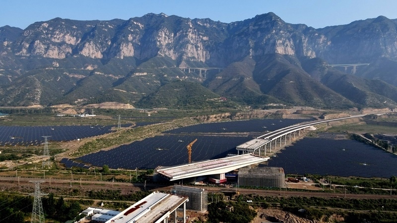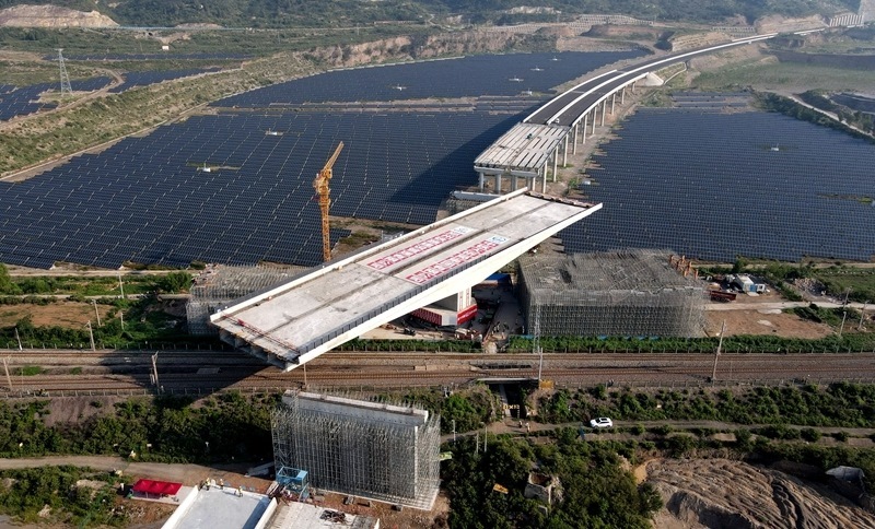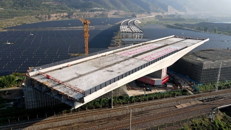 這是8月11日拍攝的河南省濟(jì)源市沿太行山高速公路跨焦柳鐵路立交橋轉(zhuǎn)體施工現(xiàn)場(chǎng)。