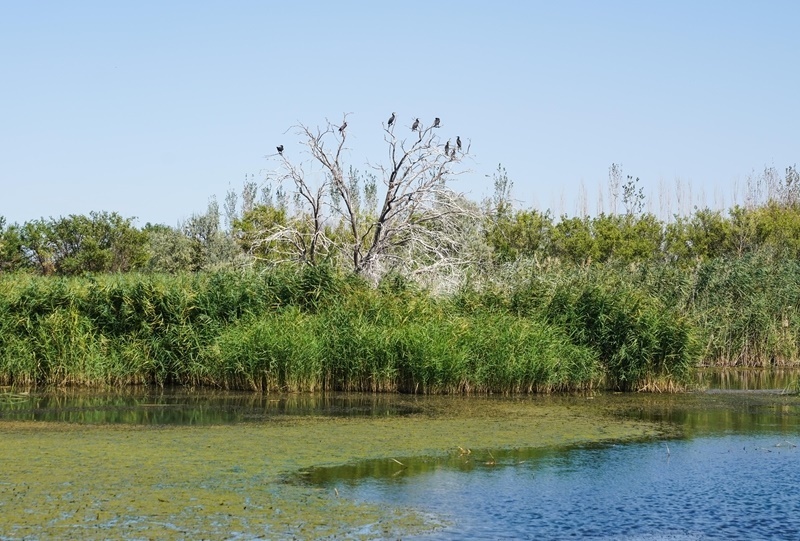 8月10日,鸕鶿在瑪納斯國家濕地公園樹枝上棲息。