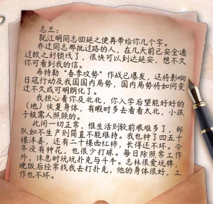 5月22日,日軍離八路軍總部只有十幾公里了,在這樣一個(gè)危急時(shí)刻,得知有人要去延安,左權(quán)決定給妻子劉志蘭寫一封信,回答她的問(wèn)題。