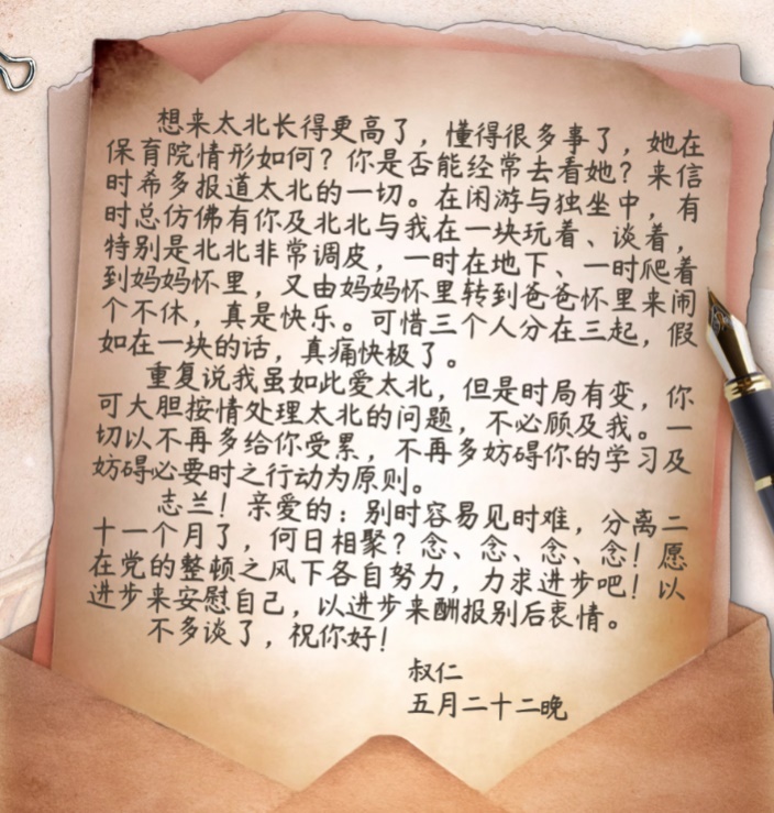 在信的最后,左權(quán)不得不忍痛交代妻子:“我雖如此愛太北,但是時(shí)局有變,你可大膽按情處理太北的問(wèn)題,不必顧及我?!辈⒚銊?lì)妻子以進(jìn)步來(lái)安慰自己,以進(jìn)步來(lái)酬報(bào)別后衷情。