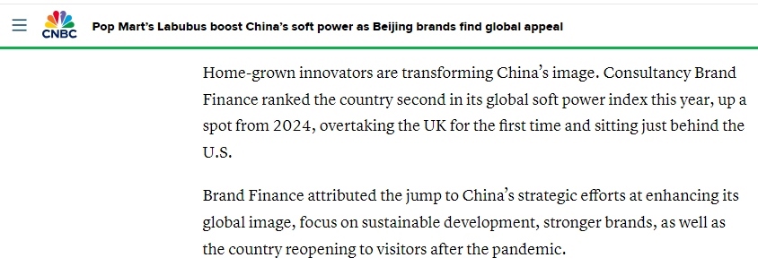 文章說,英國“品牌金融”咨詢公司今年發(fā)布的全球軟實(shí)力指數(shù)顯示,中國排名升至全球第二——較2024年上升一位,首次超越英國,目前僅次于美國。該公司分析認(rèn)為,中國軟實(shí)力躍升的重要原因在于中國提升國際形象的戰(zhàn)略性舉措、對(duì)可持續(xù)發(fā)展的堅(jiān)定投入、日益增強(qiáng)的品牌實(shí)力,以及向全球游客敞開國門。消費(fèi)分析師認(rèn)為,經(jīng)過這些努力,人們終于能穿透貼在中國產(chǎn)品身上的負(fù)面濾鏡,看清產(chǎn)品的真正價(jià)值,逐漸擺脫過去對(duì)“中國制造”的刻板偏見。
