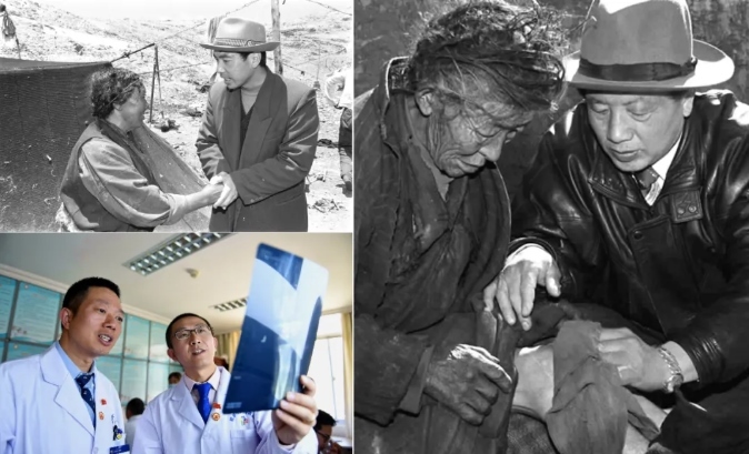 左上圖為來自陜西的援藏干部、阿里日土縣副縣長賈冗勇深入牧區(qū),幫助藏族牧民解決生產(chǎn)、生活的實(shí)際困難(新華社記者土登攝,1997年11月11日發(fā));左下圖為2017年8月3日,北京積水潭醫(yī)院援藏醫(yī)生龔曉峰(右)和北京天壇醫(yī)院援藏醫(yī)生李家謀在拉薩市人民醫(yī)院骨科病房內(nèi)查看患者的X光片(新華社記者晉美多吉攝);右圖為孔繁森(右)在阿里日土縣過巴鄉(xiāng)為孤寡老人益西卓瑪治?。ㄐ氯A社記者土登攝,1994年12月26日發(fā))。