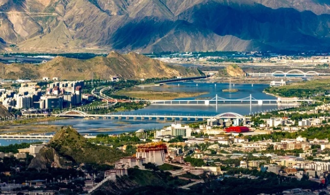 這是2025年7月30日拍攝的拉薩河風(fēng)光,由近及遠(yuǎn)分別是連心橋、柳梧大橋、和美橋和青藏鐵路拉薩河特大橋。新華社記者 姜帆 攝