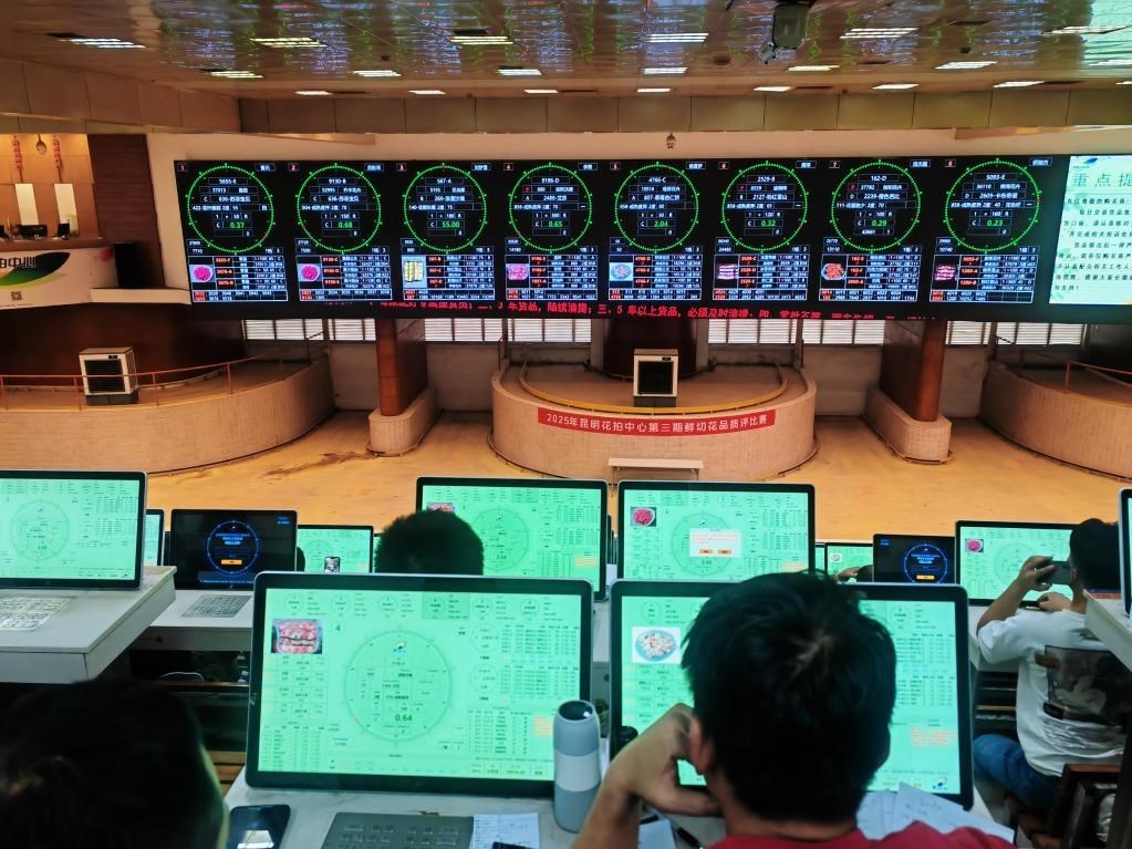 記者在昆明國際花卉拍賣交易中心看到,拍賣大鐘界面顯示著各種花卉的信息,數百名購買商操作著競價器選購鮮花。昆明國際花卉拍賣交易中心副總經理汪洋介紹,這里每天的鮮花交易量都超700萬枝,單日最高交易量超1100萬枝,30%以上的鮮花被各大電商和直播團隊拍下,他們再拿到電商平臺或直播間銷售。