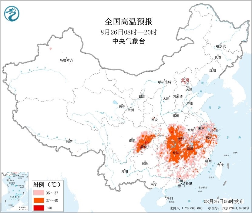 預計8月26日白天,四川東部、重慶、河南南部、湖北大部、湖南、江西、安徽中南部、江蘇南部、浙江、上海、福建大部、廣東北部、廣西北部以及新疆吐魯番盆地等地有35~39℃高溫天氣,其中,重慶中西部、湖北西南部、湖南東北部、江西北部、浙江中西部等地局地最高氣溫可超過40℃。中央氣象臺8月26日06時繼續(xù)發(fā)布高溫黃色預警。